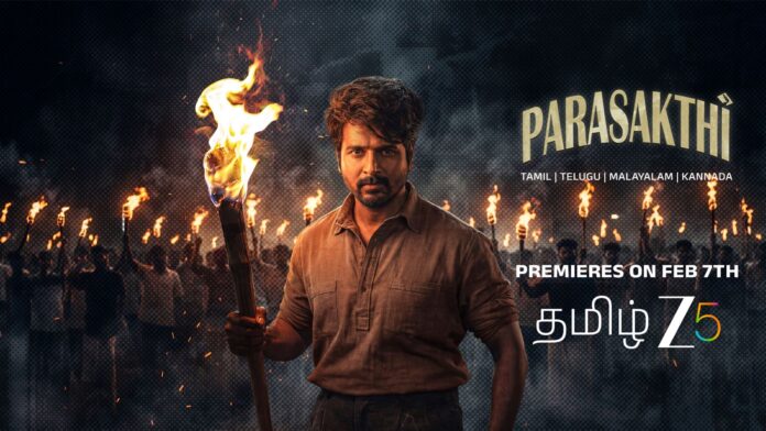 இந்தியாவின் மிகப் பெரிய உள்நாட்டு வீடியோ ஸ்ட்ரீமிங் தளமான ZEE5, மிகவும் எதிர்பார்க்கப்பட்ட பொலிடிகல் ஆக்ஷன் டிராமாவான “பராசக்தி” திரைப்படத்தை 2026 பிப்ரவரி 7 முதல் டிஜிட்டல் பிரீமியராக வெளியிடவுள்ளது. தேசிய விருது பெற்ற இயக்குநர் சுதா கொங்கரா இயக்கத்தில், Dawn Pictures நிறுவனம் சார்பில் ஆகாஷ் பாஸ்கரன் தயாரித்துள்ள இந்தப் படம், தமிழ்நாட்டின் சமூக-அரசியல் வரலாற்றிலிருந்து ஒரு சக்திவாய்ந்த அத்தியாயத்தை திரையில் உயிர்ப்பிக்கிறது.