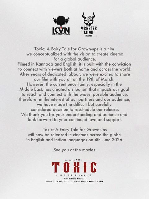 கே வி என் புரொடக்ஷன்ஸ் KVN Productions மற்றும் மான்ஸ்டர் மைண்ட் கிரியேசன்ஸ் Monster Mind Creations நிறுவனங்கள் இன்று மிகவும் எதிர்பார்க்கப்பட்ட ஆக்ஷன்-டிராமா திரைப்படமான ‘டாக்ஸிக்: எ ஃபேரி டேல் ஃபார் கிரோன்-அப்ஸ்’ படத்தின் உலகளாவிய திரையரங்கு வெளியீட்டின் மறுதேதியை நிர்ணயித்துள்ளதாக அறிவித்துள்ளனர். முதலில் 2026 மார்ச் 19 அன்று உலகம் முழுவதும் வெளியிட திட்டமிடப்பட்டிருந்த இந்த படம், தற்போது மத்திய கிழக்கில் அதிகரித்து வரும் பதற்றம் மற்றும் பிராந்திய அசாதாரண சூழ்நிலை காரணமாக இத்திரைப்படத்தின் வெளியீட்டு தேதி 2026 ஜூன் 4ஆம் தேதிக்கு மாற்றப்பட்டுள்ளது.